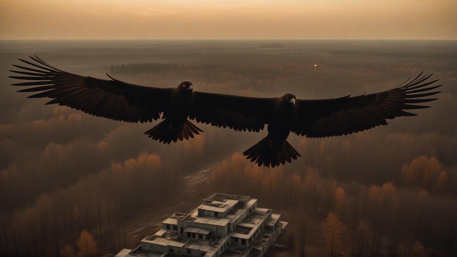This massive bird thing, wingspan of at least ten feet, floated there. Its eyes were like embers burnin’ in the twilight, seemin’ to stare right through me. The Black Bird of Chernobyl, they call it now. I stood frozen, heart poundin’ like a drum in my chest. Then, as sudden as it appeared, it veered off and vanished into the thick treeline.
