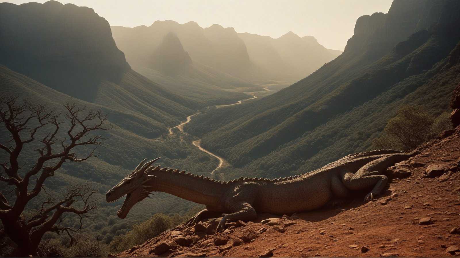 I turned towards the sound and my eyes near popped outta my head. There, slitherin’ across the terrain, was a creature so big it’d make a grown man weep. It had to be over 60 feet long, with scales shimmerin’ like a dragon’s and a horse’s head on top of all that. It moved like a snake, but it wasn’t no snake I ever seen before. As it went by, the ground shook and deep tracks were left behind, provin’ its size.